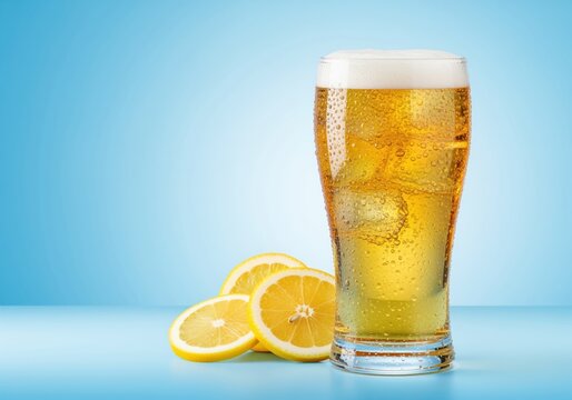 Refreshing ice cold glass of pale beer or shandy with lemon slices on a blue background