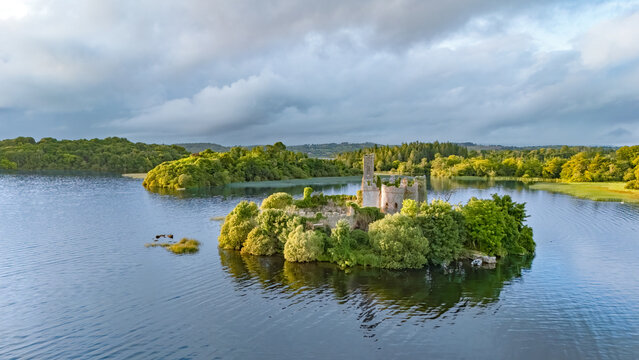 Aerial drone view of McDermotts Castle on small island in Lough Key lake, county Leitrim, Ireland