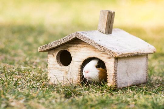 Small wooden house for guinea pig. Redent inhabits old wooden shanty on green grass.
