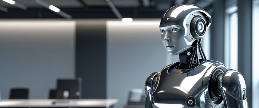 Futuristic Robot with Metallic Finish in Modern Office Environment.