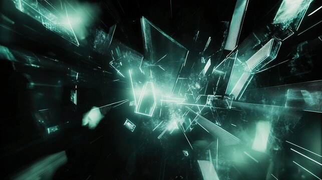 A collection of clear crystal shards float and reflect light in a mesmerizing display of geometric elegance