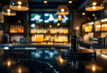 A black wine bottle stands prominently on a dark marble bar top, reflecting the warm lights of the bar, with a blurred background of shelves stocked with beverages
