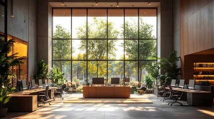 Open-plan workspace with large windows and shared desks