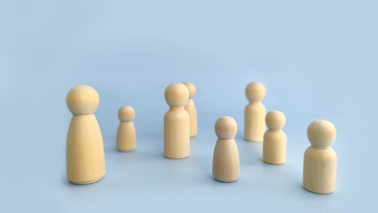 Wooden peg people arranged with shallow depth of field symbolizing team focus, direction, shared goals, and business alignment.