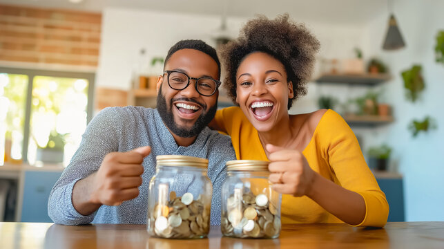 Happy couple proudly displays their savings, with jars of coins in front of them, sharing a moment of financial success at home