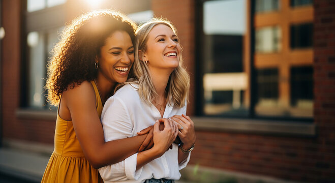 Two joyful women hugging and laughing together, perfect for happiness concepts, shared moments, and positive relationship plans