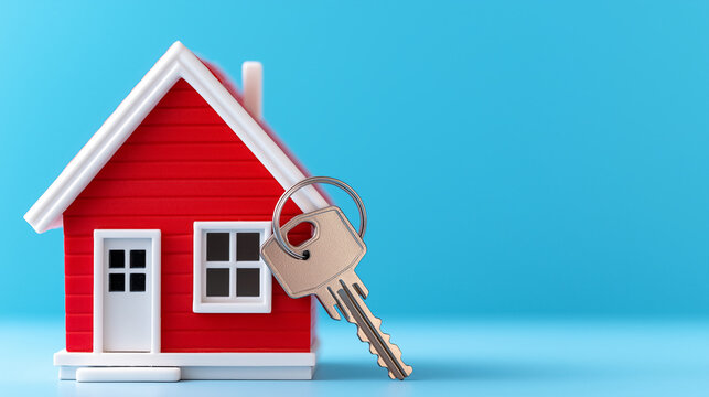 Real estate investment with a red house model and house key on blue table for homeownership goals