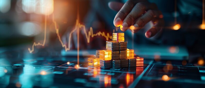 Hand stacking coins on a digital financial chart, representing growth and investment in the stock market under innovative financial technology.