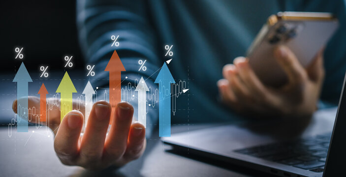 Human hand holding arrow business financial investment data graph, business growth, money, stock market, chart, interest rate, investment, funds, percent commission, banking, marketing, profit