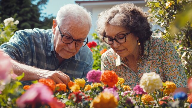 An elderly couple lovingly tends to vibrant flowers in their garden, showcasing a bond nurtured by shared interests and the beauty of nature.