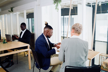Diverse business team collaborating in shared office space