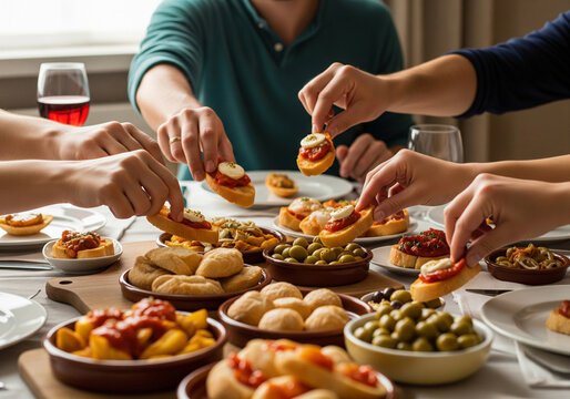 Multiracial friends laughing and sharing appetizers around modern dining table at home