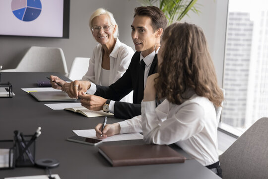 Creative problem solving. Young man manager in formal suit speak on team meeting with diverse office workers colleagues at boardroom table share fresh idea on brainstorm offer innovative business plan