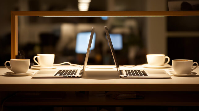 systematizing. A shared minimalist workstation with two laptops and matching coffee cups under soft lighting. lifestyle magazines.