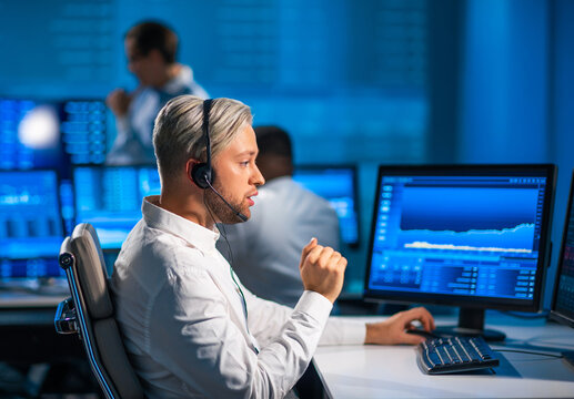 Team of brokers is working in office using workstation and analysis technology. Workplace of professional traders. Global financial markets, business, currency exchange and banking concepts.