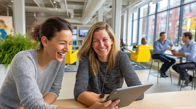 Joyful young professionals studying at office table.Positive collaborative wor environment. Image showcaes a vibrant scene of happness and teamwork among yong individuals in a sharedworkspace.