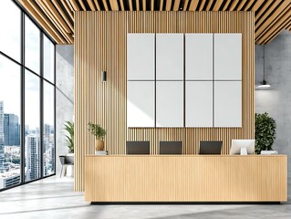 Minimalist Interior Mockup (Bangkok) with a moody cinematic feel, a luxurious dark-themed reception area in a Bangkok skyscraper, featuring a sleek black console table High-End Corporate
