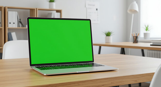 Laptop with Green Screen on Wooden Table – Mockup Template