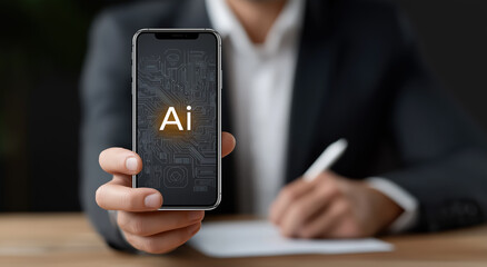 Businessman showing smartphone with AI interface artificial intelligence app and digital innovation concept for corporate technology