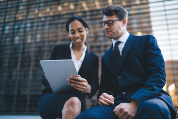 From below of contemporary smiling multiethnic woman and man sitting on bench on street and coworking on modern portable tablet
