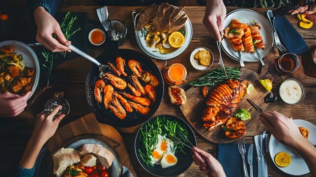 Overhead view of a table with people eating a variety of dishes.