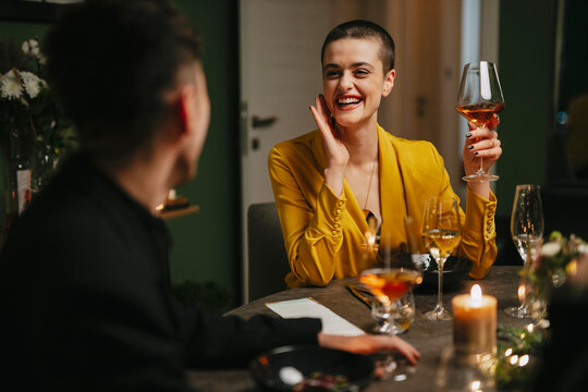Romantic dinner at home with diverse couple celebrating love
