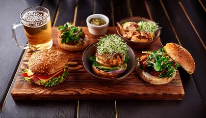 drinks gathering featuring burgers chicken salads and snacks served on wooden boards with sprouts