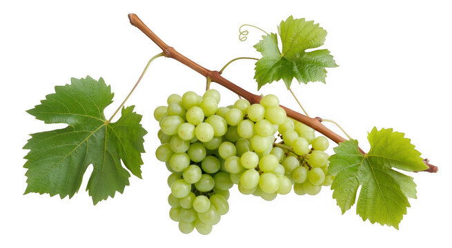 Bunch of green grapes with leaves on brown vine stem isolated on a transparent background