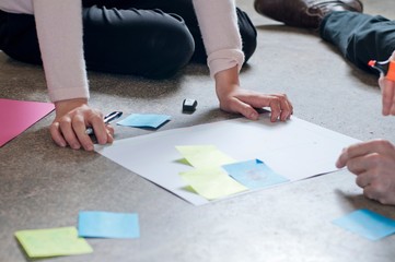 Teamwork and brainstorming concept with businessmen that share an idea with a lamp. Concept of startup