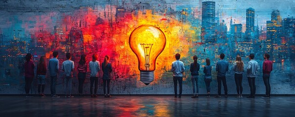 Diverse Group of College Students Brainstorming Innovative Ideas on Whiteboard with Cityscape Backdrop