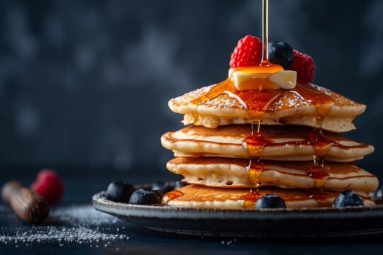 Stack of fluffy pancakes topped with melting butter and dripping syrup on a dark background, creating an appetizing breakfast display