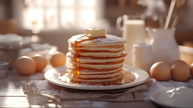 Stack of fluffy pancakes with butter and syrup on a rustic kitchen table, morning light streaming in