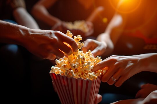 Friends enjoy a movie night together at the cinema sharing popcorn and laughter in the evening hours of a local theater