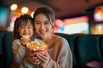A woman and a young girl smiling and sharing a popcorn at a cinema