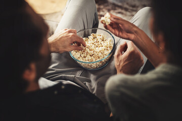 Couple relaxing with popcorn in cozy living room