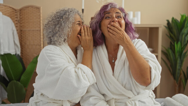Mature women with curly hairstyles wearing white robes share a secret and laugh together in a cozy wellness spa room