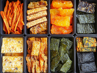 Assorted international snack box featuring various textures and flavors, including crispy seaweed, sweet fruit jellies, and crunchy snacks, perfect for sharing or enjoying alone