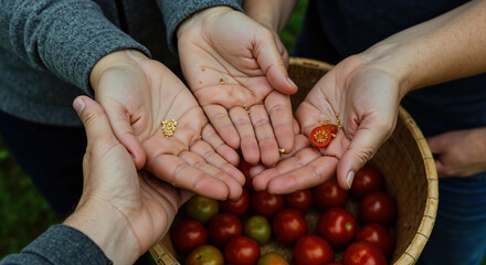 Hands holding fresh strawberries over wooden bowl full of ripe berries. Family sharing healthy organic fruit harvest together. Seasonal farming and nutrition concept for banner