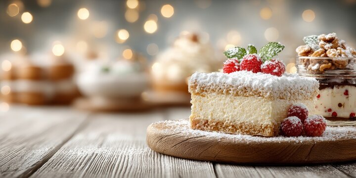 Festive dessert scene featuring cheesecake with strawberries and mint, mixed nuts and berries, set against warm holiday bokeh lights