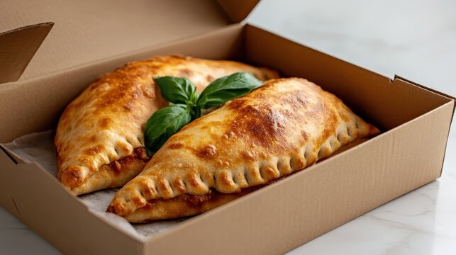 Two golden-brown calzones filled with savory ingredients are perfectly presented in a takeout box, adorned with a fresh basil leaf for an inviting touch.