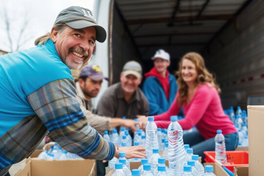 A person hands a water bottle to another during an outdoor event or race at sunset.