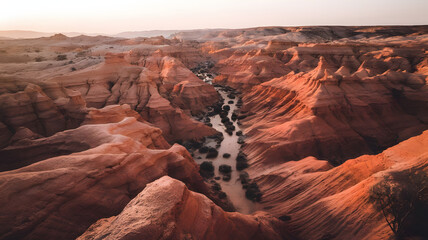 A winding canyon with sharp rock formations, lit by soft, golden hour light