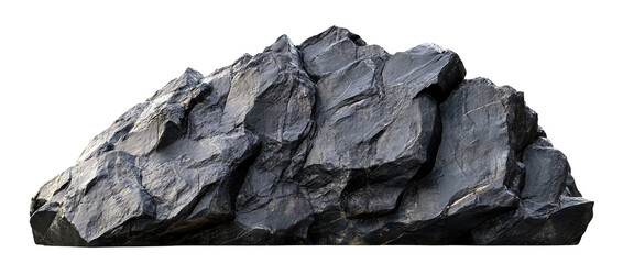 Large black stone outcrop with sharp edges, isolated on transparent cutout background