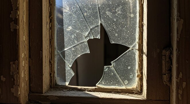 Closeup of a shattered glass window with a bullet hole, revealing a blurred orange background, creating drama