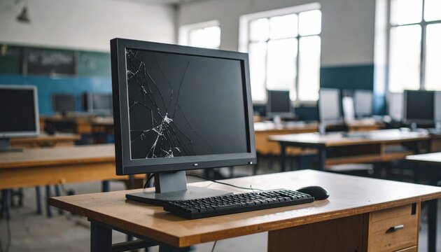 Cracked Computer Monitor in Classroom: A broken computer monitor sits on a desk in a classroom, its shattered screen a stark symbol of technological disruption and educational challenges.