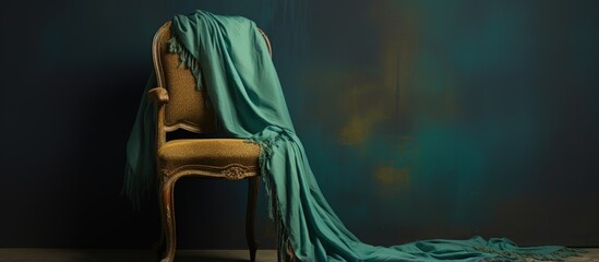 Cute young woman sits in armchair with her shoulders wrapped in colorful silk shawl
