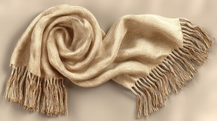 Soft beige pashmina shawl with red and navy paisley print, casually draped. Luxurious texture and warm autumnal colors.