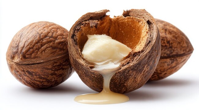 Premium photo of shea butter in cracked nuts on white background.
