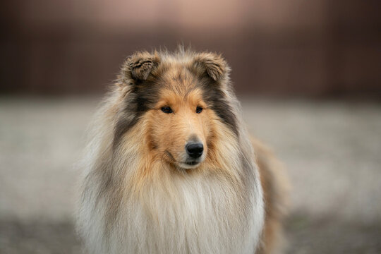 Adorable Old English Sheepdog sitting on asphalt roadway on background of majestic sundown