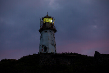 Rudny lighthouse at Cape Briner in the village of Smychka (Rudnaya Pristan), Primorsky Territory. The beautiful Rudny lighthouse stands on a sheer cliff against the backdrop of a bright dawn